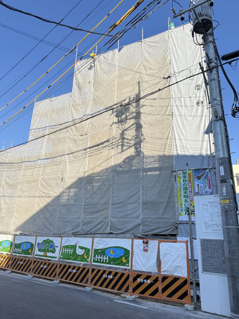 外から見ると、建物全体に養生シートがかけられており、11月と大きく変わらないように見えるかもしれません。これは、外壁などの工事を安全に行い、建物や資材を雨風から守るためのものです。